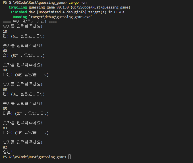 정답일 경우 종료하려면 Ordering::Equal 조건에 break를 추가합니다.