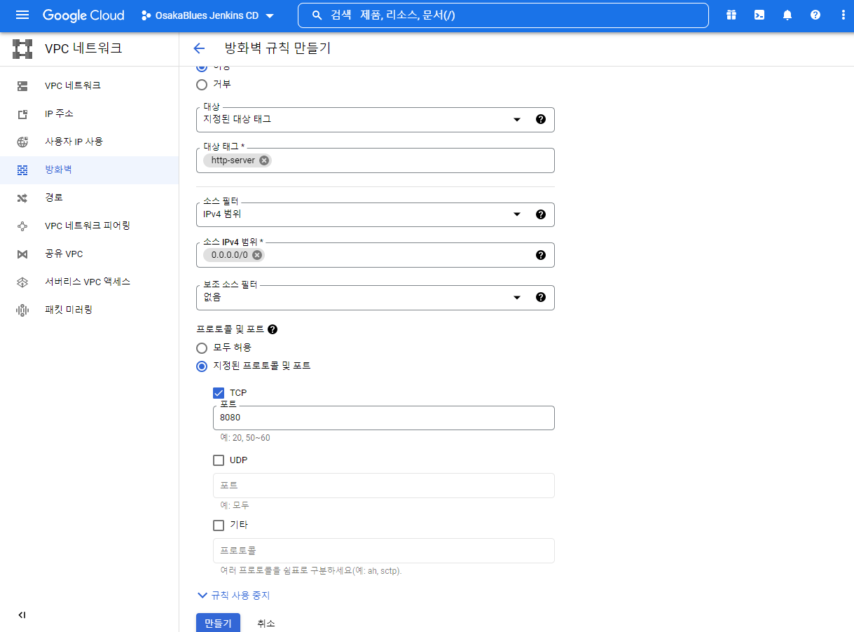 이제 VM인스턴스 네트워크 설정에 가서 VPC 네트워크 - 방화벽 - 방화벽 규칙 만들기를 누릅니다. 그리고 대상은 http-server, IPv4모든 범위에 8080포트를 열어 줍니다.