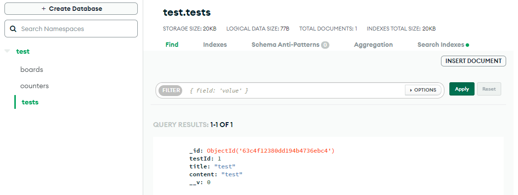 MongoDB Atlas에 접속해서 Collection탭을 누르면 현제 데이터베이스에 저장된 값을 확인할 수 있습니다. Counter랑 Test를 확인해봅시다.