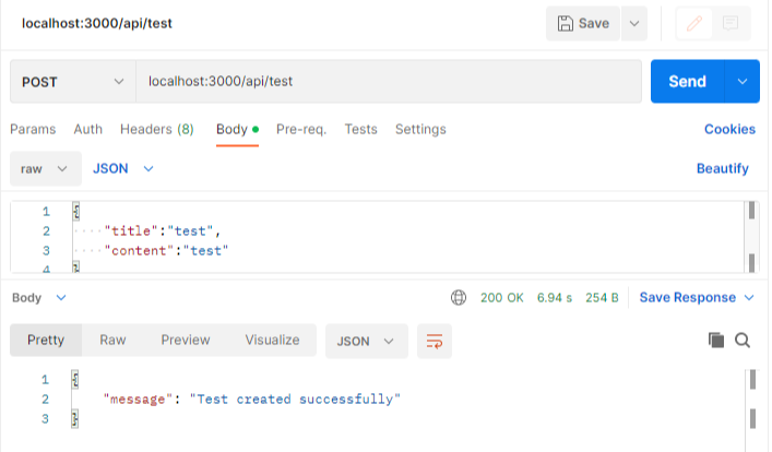 yarn dev로 앱을 실행해봅시다. 그리고 Postman으로 loacalhost:3000/api/test로 POST요청을 보냅니다. 밑에 응답을 보면 올바르게 저장된 것을 확인할 수 있습니다.