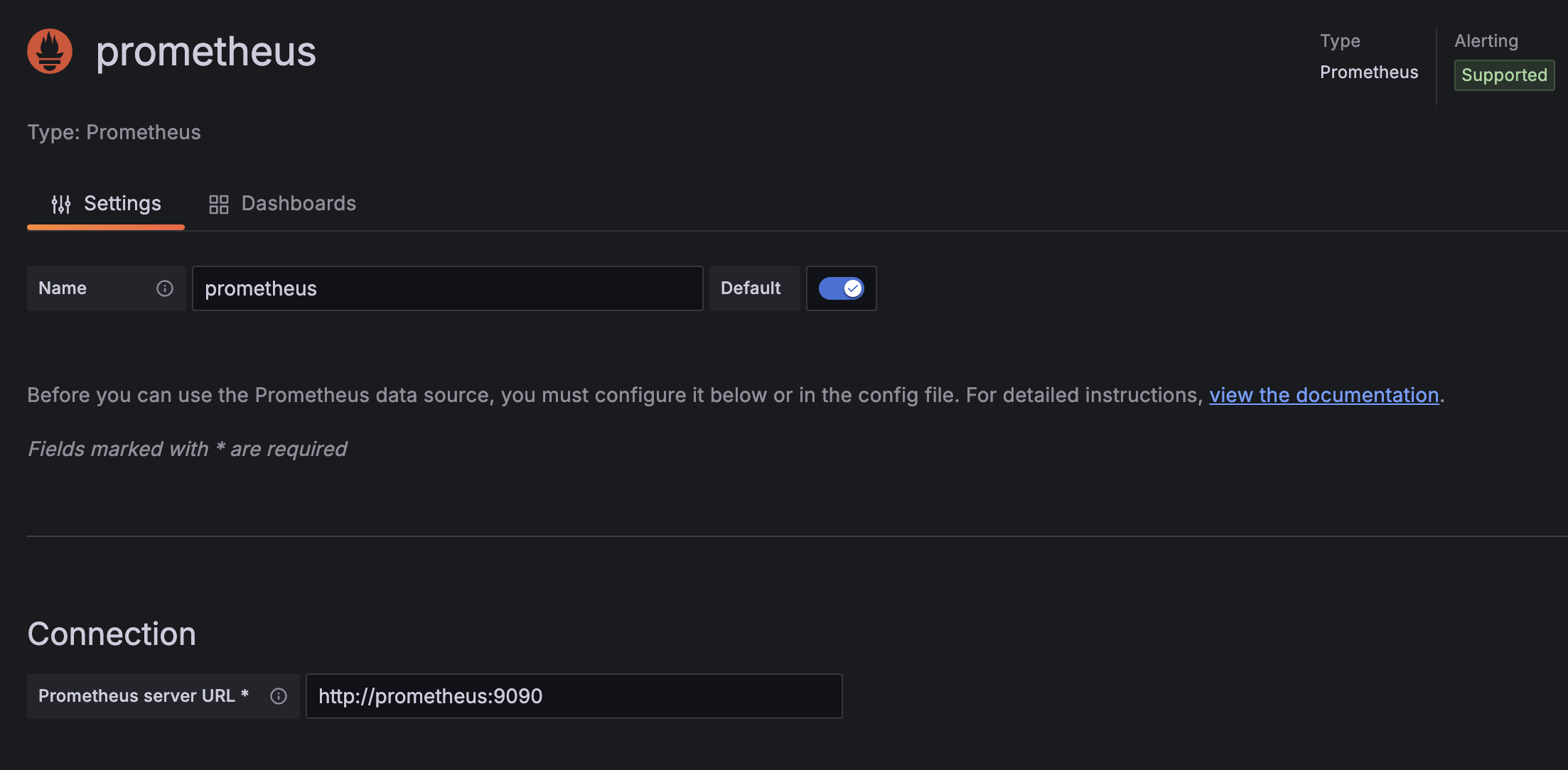 Connection - Data source로 접속해서 prometheus와 연동해줍니다. prometheus와 grafana는 같은 docker network에 있기 때문에 서비스 이름으로 URL을 설정해줍니다.